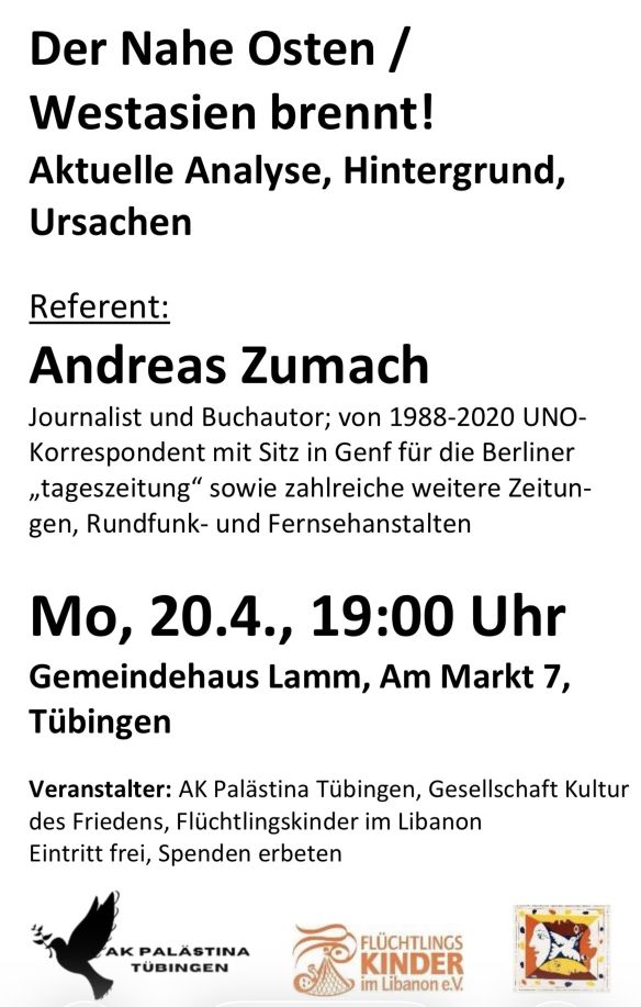 Eintritt: 5 Euro Solidaritätsbeitrag (nur Abendkasse) Veranstalter: Gesellschaft Kultur des Friedens, info@kulturdesfriedens.de mit Unterstützung von Universitätsstadt Tübingen – Fachbereich Kultur