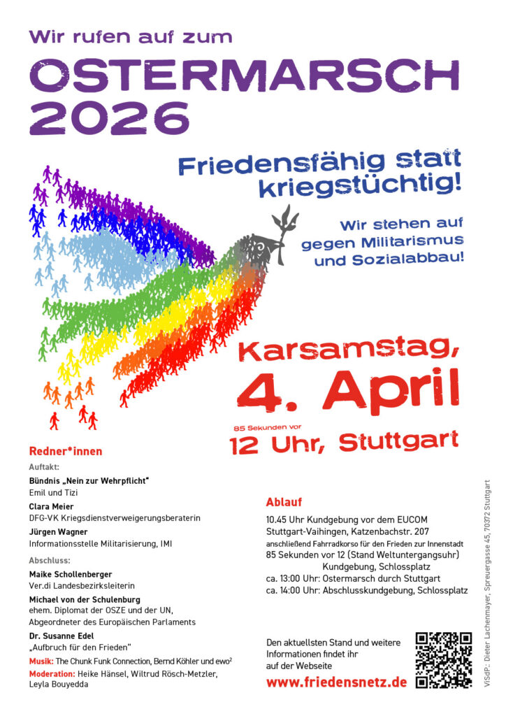 Wir rufen auf zum Ostermarsch am Karsamstag, den 30. März 2024. Beginn 90 Sekunden vor 12 Uhr (Stand Weltuntergangsuhr) Stuttgart, Schlossplatz Ablauf 10.45 Uhr Kundgebung vor der EUCOM Stuttgart-Vaihingen, Katzenbachstr. 207 Redner: Gerhard Jüttner, stellv. Landesvorsitzender NaturFreunde Württemberg anschließend Fahrradkorso für den Frieden zur Innenstadt 90 Sekunden vor 12 (Stand Weltuntergangsuhr) Kundgebung, Schlossplatz ca. 13:00 Uhr Ostermarsch durch Stuttgart ca. 14:00 Uhr Abschlusskundgebung, Schlossplatz Rednerinnen