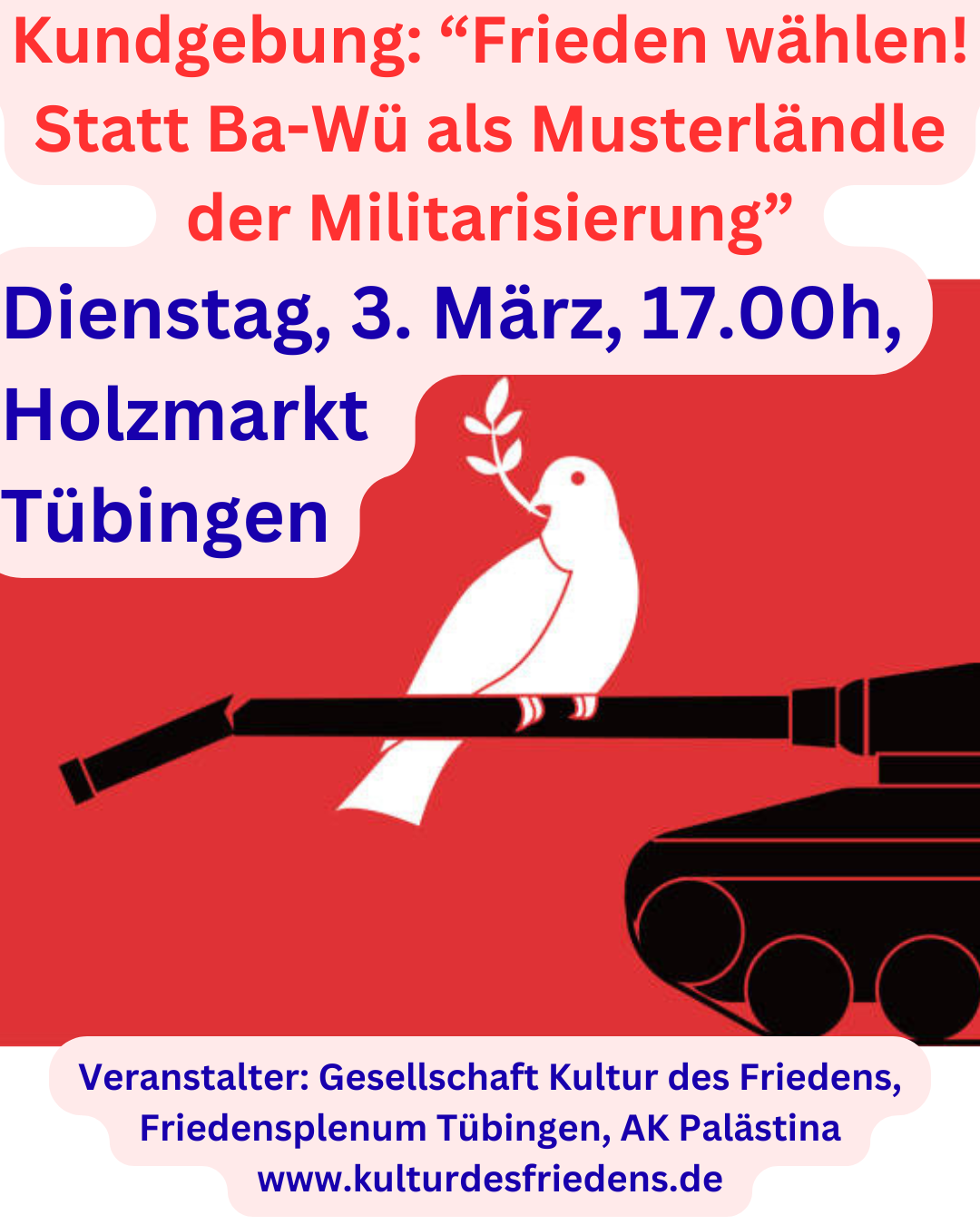 Veranstalter: Gesellschaft Kultur des Friedens, Friedensplenum Tübingen, AK Palästina, Friedensmahnwache Tübingen.